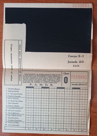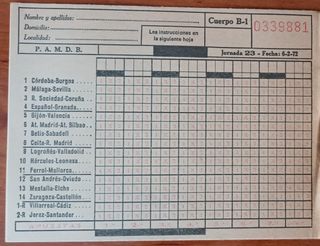 Papeleta de quiniela sin usar de la jornada 23 de 1972 y otra de 1973 sellada