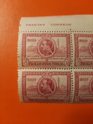 Pro Exposiciones de Sevilla y Barcelona. Bloque de 4 sellos. Nuevos con goma original y SIN señal de fijasellos. Muy buena conservación. El precio es por todo el bloque. - Serie de sellos conmemorativos. - Diseño que incluye imágenes de la Exposición General Española. - Valor facial de 4 pesetas.