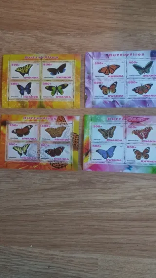 Conjunto de sellos de Ruanda con temática de mariposas. - Incluye 4 hojas de sellos. - Cada hoja contiene 4 sellos. - Diseños variados de mariposas.