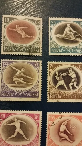 Lote de 7 sellos de Polonia con temática de los Juegos Olímpicos Melbourne 1956 - Sello de 10 GR con figura en patinaje artístico. - Sello de 25 GR con remero. - Sello de 155 ZŁ con saltadora. - Sello de 20 GR con boxeadores. - Sello de 60 GR con lanzador de jabalina. - Sello de 155 ZŁ con marca de 6.35 m. - Sello de 40 GR con corredor de vallas.