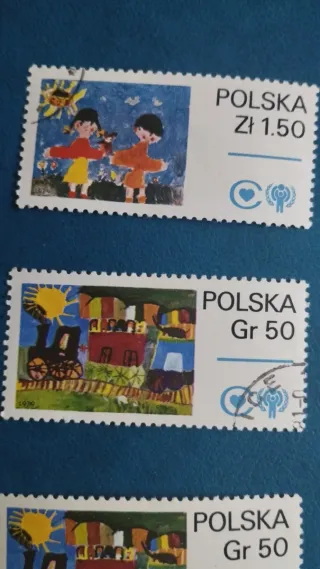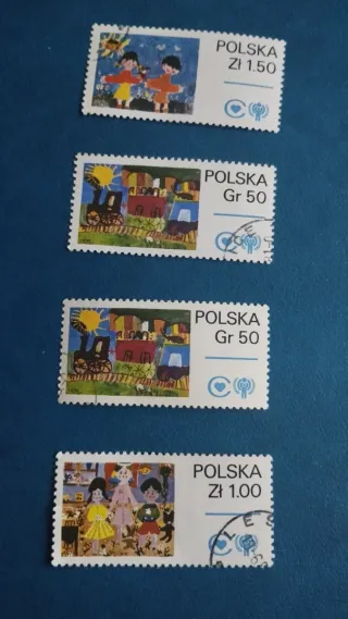 Conjunto de cuatro sellos de Polonia con temática infantil. - Sello de 1.50 Zł con dos niños jugando. - Dos sellos de 50 Gr con un tren y casas. - Sello de 1.00 Zł con tres figuras y un gato.