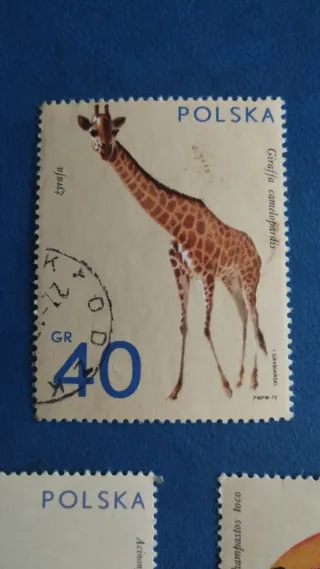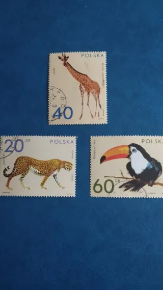 Conjunto de tres sellos de Polonia con ilustraciones de animales. - Sello de jirafa con valor de 40 GR. - Sello de guepardo con valor de 20 GR. - Sello de tucán con valor de 60 GR.