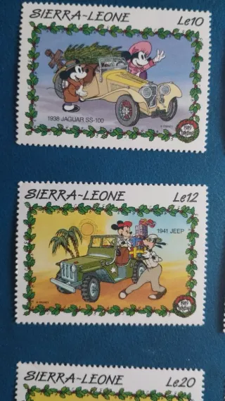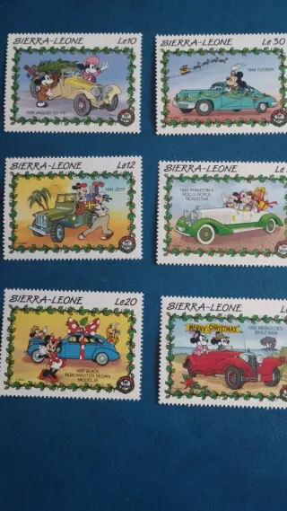 Conjunto de 6 sellos de Sierra Leona con personajes de Disney y coches clásicos. - Sello Le10: Mickey y Minnie en un Jaguar SS 100 de 1936. - Sello Le30: Mickey en un Tucker de 1948. - Sello Le12: Goofy y Pluto en un Jeep de 1941. - Sello Le (sin valor visible): Mickey y Minnie en un Rolls Royce Phantom I de 1924. - Sello Le20: Minnie y Mickey en un Buick Roadmaster de 1937. - Sello Le (sin valor visible): Mickey y Minnie en un Mercedes Benz Sook de 1935.