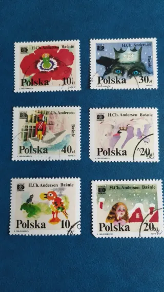 Conjunto de sellos de Polonia con temática de H. Ch. Andersen. - Sello con amapola roja y valor de 10 zł. - Sello con gato coronado y valor de 30 zł. - Sello con soldado de plomo y barco de papel, valor de 40 zł. - Sello con cisnes y valor de 20 zł. - Sello con patito feo y valor de 10 zł. - Sello con niña en la nieve y valor de 20 zł.