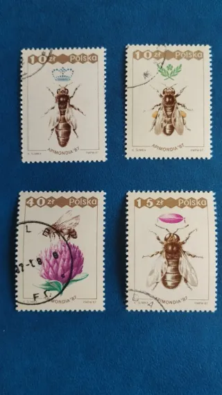 Conjunto de cuatro sellos de Polonia con temática de abejas, emitidos en 1987. - Diseño de abejas y flores. - Valor facial de 10 zł, 10 zł, 40 zł y 15 zł. - Inscripción APIMONDIA '87 en algunos sellos.