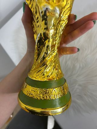 Trofeo réplica de la copa del mundo 27 cm, para hacerla pesada por dentro lleva arena. Cuando me la mandaron, al ir boca abajo, la bola del mundo lleva ciertas partes que no están selladas al 100% y ha salido un poco de polvo. Al limpiarlo se le ha ido algo el baño de color como puede verse en las imágenes. Por todo lo demás, esta nueva.