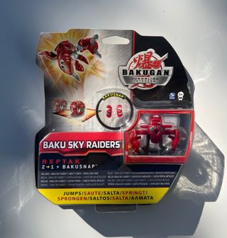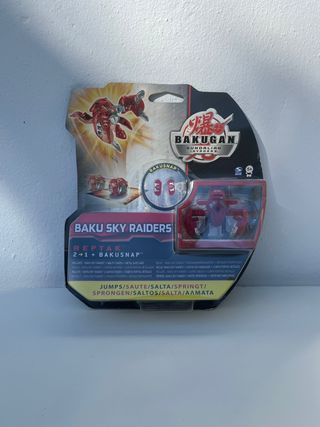 1 Blister de Bakugan Gundalian Invaders. “REPTAK”, color rojo. Baku Sky Raiders, son Bakugan que saltan cuando los enrollas en una tarjeta de puerta. Cuando se cierra como una bola, los Sky Raiders miden alrededor de 3 cm de diámetro. El Blister contiene 1 Baku Sky Raider +2 Cartas Poder +1 Carta Portal Metálico. Como se puede apreciar en las fotos del anuncio, el artículo se encuentra en muy buenas condiciones, cerrado y sellado en su blister original desde el día de su fabricación, aunque el cartón un poco doblado.