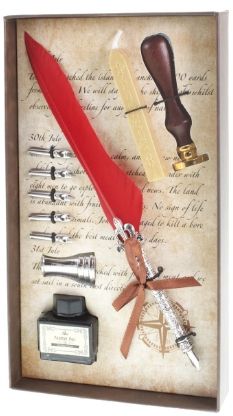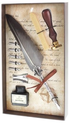 Set pluma de ave en color, con 5 plumillas de caligrafía diferentes , con tintero y lacre con su sello. Dispone de un cono especial para apoyar las plumas. Bonito estuche de regalo tipo antiguo. ideal para coleccionar o hacer un regalo a los amigos. Características: Caja: 26x15x4, 12.50 gr.