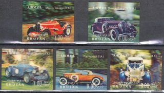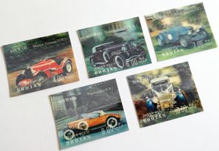 Lote de 5 sellos conmemorativos en 3D (efecto lenticular) | Buthan (Bután), 1971 | Nuevos, sin señal de fijasellos (MNH) | Serie: automóviles / coches | Temas: Morris Garage, Duesenberg, Aston Martin, Packard y Rolls Royce | Nº catálogos » Yvert et Tellier BT PA 88/92 ; Michel BT 455/59 | Valores faciales: 4, 6, 7, 9 y 10 Ngultrum butanés | Precio según catálogo Michel: 14 € | Medidas: 50 x 40 mm | Somos filatelia.