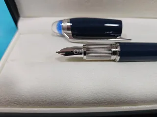 Elegante pluma Montblanc Starwalker con un diseño inspirado en el planeta azul. El capuchón presenta el icónico emblema de la marca. - Tono azul profundo. - Plumín de tamaño F (fino). - Detalles metálicos plateados. - Nunca se ha usado. - Garantía sellada.