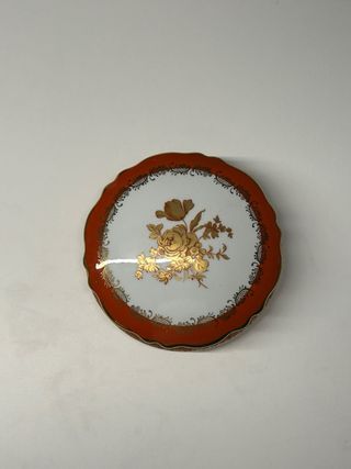 Caja redonda de porcelana Limoges, hecha en Francia, con decoración floral en dorado sobre fondo blanco y borde rojo-anaranjado. Con sello original en la base “Limoges – Made in France”. - Decoración clásica con detalles dorados - Ideal para colección, decoración o joyero - Buen estado general, con ligeras señales de uso en el interior -Medidas aprox.: 12–13 cm de diámetro