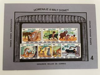 Conjunto de sellos conmemorativos de Homenaje a Walt Disney de Bhutan. - Diseño inspirado en personajes de Disney. - Incluye varios sellos con diferentes escenas. - Texto en BHUTAN y DHUTAN en los sellos.