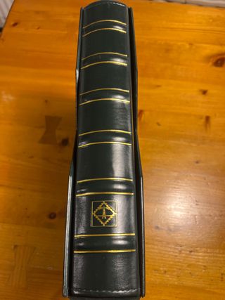 Clasificador de sellos en color verde con detalles dorados.8 hojas von sellos a 2 caras hay algunos que no están matasellados . - Incluye 8 hojas para organizar tus sellos. - Cubierta de material sintético.