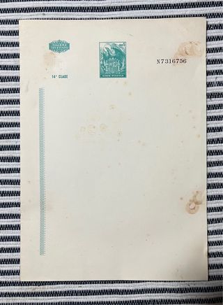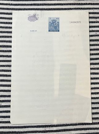 Pliego timbrado oficial de 14ª clase con valor de cinco pesetas. - Diseño con escudo y águila, años 1940/50 - Número de serie N7316756. - Se trata de un entero fiscal (papel con sello ya impreso) que servía para redactar documentos oficiales, notariales o administrativos de la época franquista. Suelen llevar un sello seco con el águila imperial.