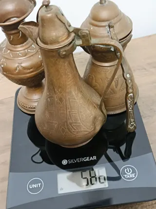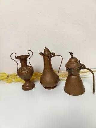Set decorativo de 3 piezas de artesanía vintage en cobre/latón con hermosos grabados hechos a mano. El conjunto tiene un estilo rústico y elegante, ideal para dar un toque bohemio o "vintage" a cualquier rincón. Medidas: La pieza central tiene una altura de 20 cm. Peso del lote: 586 gramos (metal sólido y de calidad). Autenticidad: La pieza principal incluye el sello de origen "ALBANIA 130" en su base, garantizando su procedencia artesanal. Piezas: Incluye jarra alta, cafetera tradicional y jarrón de doble asa. Estado: Aceptable conservando su pátina original antigua. #antiguedades #decoracionrustica #cobrevintage #coleccionism