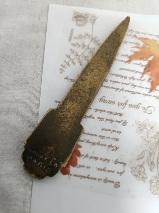 Precioso abrecartas antiguo de la Belle Époque francesa. Una pieza con historia y mucha personalidad para escritorio o coleccionismo. Fabricante: Sello "CHODOT Ed. PARIS" en el reverso. Historia: Objeto publicitario de la antigua casa textil "Les Tissus A.G.B.". Material: Bronce macizo con un peso de 63 gramos. Estado: Conserva su pátina original verde/turquesa típica del paso del tiempo (no se ha pulido para mantener su valor histórico). Diseño: Estilo Art Nouveau con relieves vegetales. !Echa un vistazo en mi perfil tengo más antigüedad !