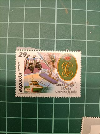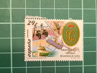 Sello conmemorativo de la Guardia Civil de España. 150 años de servicio - Valor facial de 29 pesetas. - Emitido en el año 1994. - Ilustra vehículos y emblema de la Guardia Civil. W03