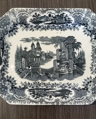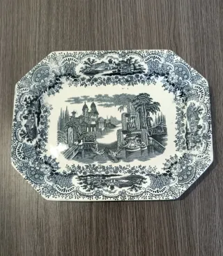 Fuente antigua de Pickman y Cia, según sello de finales del siglo XIX (1850 aprox.) Presenta un patrón detallado con un paisaje clásico. Mínimo desgaste debido a su tiempo. Sin pelos ni roturas, muy buen estado general. Marcas/sellos originales según fotos en detalle las cuales forman parte de la descripción. Medidas aprox; Largo- 32cm, Ancho- 24'5cm.