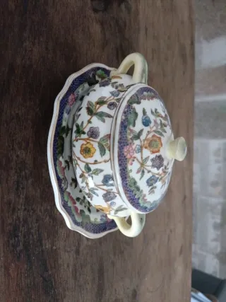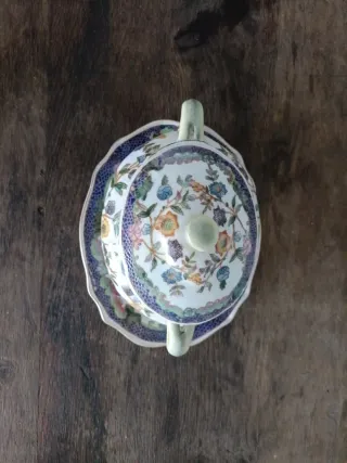 Pequeña sopera Wong Lee (WL). El sello rojo en el reverso muestra un escudo con una corona, flores de lis y la fecha "1895". La superficie de porcelana presenta un craquelado distintivo. Wong Lee es conocido por sus reproducciones y piezas de estilo antiguo, a menudo inspiradas en la porcelana china y francesa. El reverso tiene un borde festoneado . - Diseño floral multicolor. - Incluye tapa. - Asas laterales. - Medidas con plato 17x10x11 cnt de alto aproximadamente.