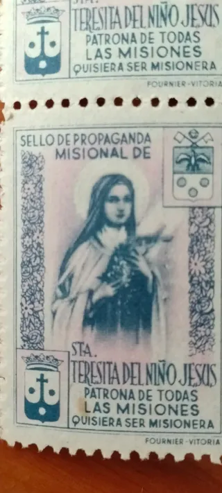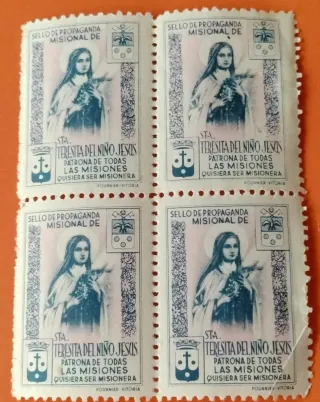 Lote de 4 sellos de propaganda misional.- Diseño de Santa Teresita del Niño Jesús.- Texto: Sello de Propaganda Misional de Sta. Teresita del Niño Jesús, Patrona de todas las Misiones, Quisiera ser Misionera .-Impresos porFournier-Vitoria .sello de propaganda misional de Santa Teresita del Niño Jesús es de 1936. Estos sellos fueron utilizados para recaudar fondos o concienciar sobre las misiones católicas.