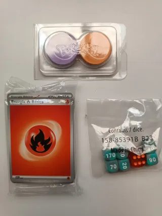 Set de accesorios de Pokémon que incluye cartas de energía, dados y monedas. Producto SELLADO. - Dos monedas con logo de Pokémon (morada y naranja) (sin abrir). - Energías Básicas (sin abrir). - Siete dados (sin abrir).