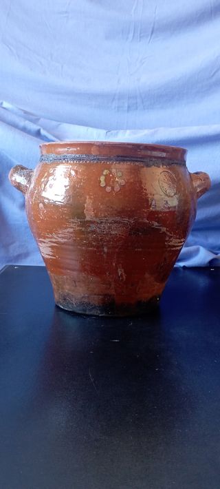 Olla de barro antigua, con un diseño tradicional y un sello de alfarero visible. Alto 23 cm Boca 22 cm Base 16 cm - Material: Barro - Color: Marrón rojizo - Asas laterales - Decoración floral en relieve