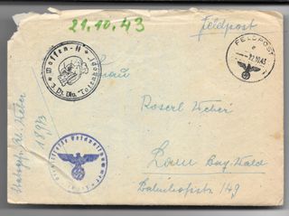 Carta - Sobre Original de la Segunda Guerra Mundial. PRECIO NO NEGOCIABLE, Carta Original WWII - SEGUNDA GUERRA MUNDIAL - WWII Segunda Guerra Mundial - Buen estado tal como se aprecia en la foto. - Sello de Feldpost. - Fecha: 22.10.43. - Destinatario: Roserl Weber, Rosen Bay. Wald, Bahnhofstr. 149. - Remitente: Habogefr. Pl. Heber, 1893. Solamente se exponen como artículos históricos coleccionables, en base a su interés para colecciones privadas filatélicas, numismáticas, militaría, o para investigación histórica..