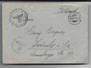 Carta original de la Segunda Guerra Mundial, utilizada como Feldpost (correo de campaña). PRECIO NO NEGOCIABLE, Carta Original WWII - SEGUNDA GUERRA MUNDIAL - WWII Segunda Guerra Mundial - Buen estado tal como se aprecia en la foto. - Sello de Feldpost con fecha 29.12.41. - Dirección escrita a mano: Henry Bergner, Zwönitz i. Sa., Annaberger Str. 10. - Carta escrita a mano en Aleman. Solamente se exponen como artículos históricos coleccionables, en base a su interés para colecciones privadas filatélicas, numismáticas, militaría, o para investigación histórica..
