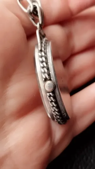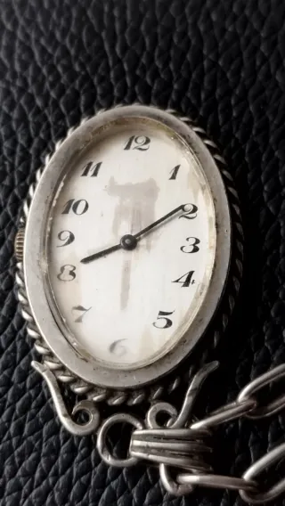 Elegante reloj colgante antiguo con detalles en plata. Tiene tres sellos impresos La cadena también es de plata y tiene un sello impreso- pesa 44 gramos Hase tiempo que no se usa - no funciona Necesita revisión - tiene finos desgastes - Diseño ovalado. - Cadena de plata. - Esfera con números arábigos.