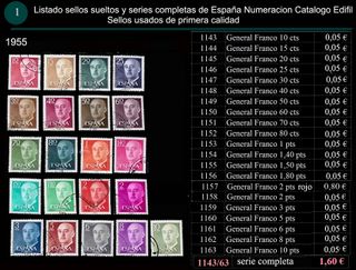 Listado de sellos del año 1955 en series completas y sueltos. Sellos usados de primera calidad. En la fotos de ve la descripción y el precio. Para pedir elguna serie o series determinadas completas o sellos sueltos, hacer una lista con el número edifil que viene en el listado y hago un lote con esos sellos rerervandolo a su nombre y mo lo compra en la aplicación, o tambien puedo enviar por correo los sellos de esa lista a la dirección que me de, en ese caso el pago sería por Bizum. Entrar en mi perfil para ver mas ofertas de sellos.