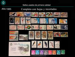 Año 1985 completo (45 valores + 1 hoja bloque + 1 recortado de la hoja bloque) y sellos sueltos y series completas de ese año, en las fotos se puede ver la descripción y el precio. Sellos usados de primera calidad. Entrar en mi perfil para ver mas ofertas de sellos