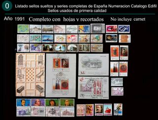 Año 1991 completo (44 valores + 3 hojas bloque + 6 recortados de las hojas bloque) y sellos sueltos y series completas de ese año, en las fotos se puede ver la descripción y el precio. Sellos usados de primera calidad. Entrar en mi perfil para ver mas ofertas de sellos