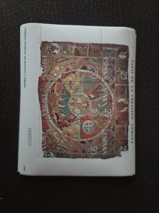 Lote de sellos de España con la imagen del Tapiz de la Creación de Gerona. - Valor facial de 25 pesetas. - Incluye la inscripción FABRICA NACIONAL DE MONEDA Y TIMBRE 1980. - x8 planchas Perfecto estado. Envio súper rapido. Cualquier duda pregunta Visita perfil por tema de lotes.