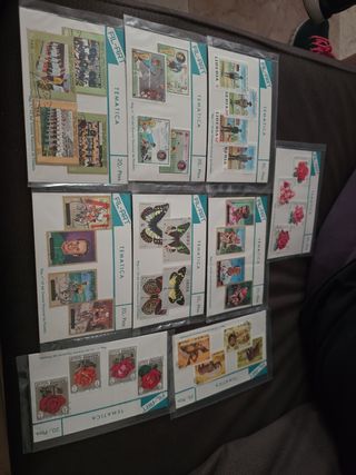 Conjunto de planchas de sellos temáticos de la marca FIL-ART. - Incluye sellos de Liberia. - Motivos de rosas y mariposas. - Temática deportiva y retratos. - x9 planchas