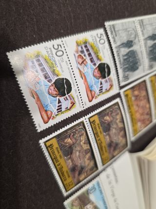 Colección de sellos de España de los años 70 y 80. Se encuentra en un álbum de filatelia. - Incluye varios bloques de sellos temáticos. - Algunos sellos muestran ligeras señales de uso y paso del tiempo. - Ideal para coleccionistas o aficionados a la filatelia. Envio súper rapido. Se envolverá de la mejor manera posible para que llegue a destino de manera adecuada. Cualquier duda pregunta