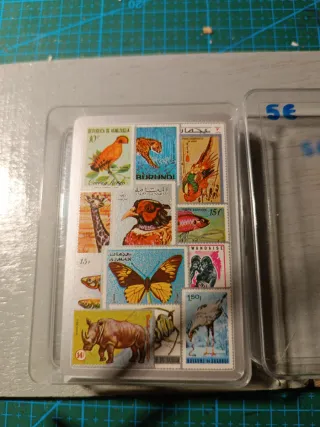 Baraja de cartas con imágenes de sellos postales de animales y aves. - Diseño de sellos de Venezuela, Burundi y Ajman. - Incluye imágenes de animales como rinoceronte, jirafa, leopardo y mariposa. - También presenta aves y peces.