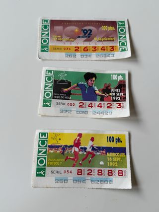 Conjunto de tres cupones de la ONCE del año 1992, conmemorativos de la Exposición Universal de Sevilla. - Cupón del viernes 18 de septiembre de 1992, correspondiente a la Serie 034. - Cupón del lunes 28 de septiembre de 1992, dedicado a los Paralímpicos de Tenis de Mesa, Serie 020. - Cupón del miércoles 16 de septiembre de 1992, dedicado a los Paralímpicos de Fútbol 7, Serie 054. También se venden por separado: Expo 92: 3 € Paralímpicos: 2 € cada uno