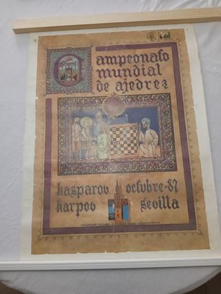 cartel oficial del campeonato mundial de ajedrez de 1987 que fue celebrado en Sevilla, protagonizado por Anatoli Kárpov y Garri Kaspárov con sus sellos originales y oficiales sellados por la organización de ajedrez.