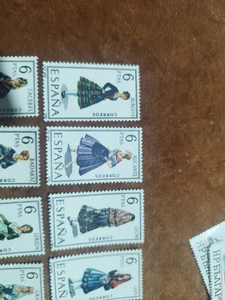 Conjunto de 14 sellos de España con trajes populares. - Sellos de diferentes provincias españolas. - Cada sello tiene un valor de 6 ptas. - Representan vestimentas tradicionales.