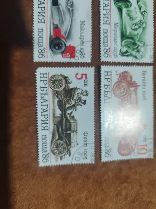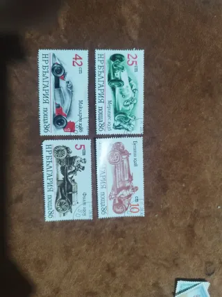 Conjunto de cuatro sellos con temática de automóviles clásicos y modernos. - Sello de 42 cm con Maklaren 1986. - Sello de 25 cm con Mercedes 1936. - Sello de 5 cm con Fiat 1905. - Sello de 10 cm con Bugatti 1928.