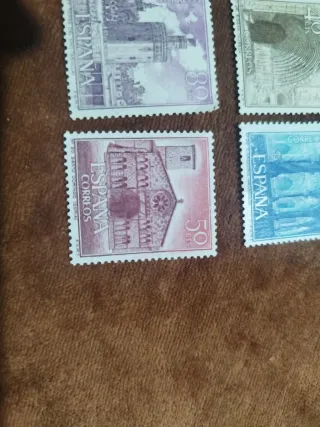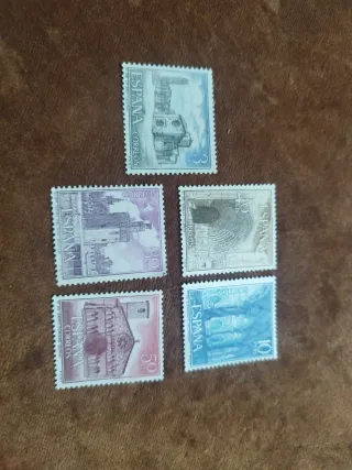 Conjunto de cinco sellos de España que representan lugares emblemáticos. - Sello de 3 ptas. de La Seo de Lérida. - Sello de 40 cts. de un acueducto. - Sello de 80 cts. de la Torre del Clavero. - Sello de 50 cts. de Santo Domingo de Soria. - Sello de 10 ptas. de S Gregoriano Valladolid