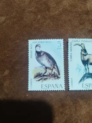 Lote de 3 sellos de España con ilustraciones de animales. - Sello de Perdiz Roja (Alectoris rufa) - 5 Ptas. - Sello de Cabra Montés (Capra pyrenaica) - 8 Ptas. - Sello de Avutarda (Otis tarda) - 1 Pta.