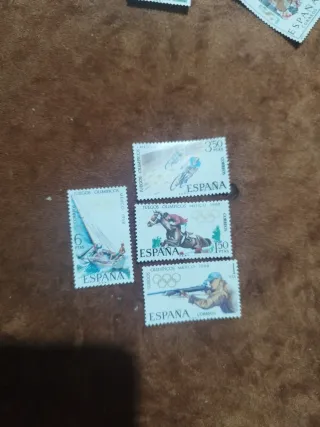 Conjunto de cuatro sellos conmemorativos de los Juegos Olímpicos de México 1968. - Sello de vela, 6 ptas. - Sello de ciclismo, 350 ptas. - Sello de equitación, 150 ptas. - Sello de tiro, 1 pta.