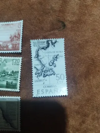 Conjunto de sellos de España con diferentes diseños y valores. - Sello de Alaska, 6 ptas. - Sello de Poblado de Nutka, 120 ptas. - Sello de Costa de Nutra, 50 cts. - Sello de Costa Septentrional de California, 3 ptas.