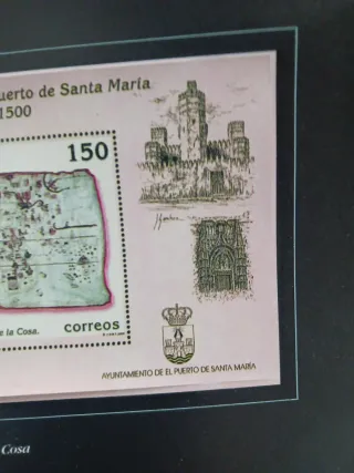 Sello conmemorativo de España. - Representa el mapa de Juan de la Cosa. - Emitido en el Puerto de Santa María en el año 1500. - Valor facial de 150 pesetas. - Referencia: 0103516.