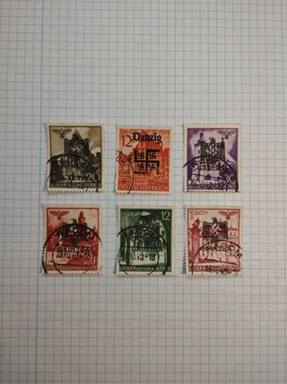 Se venden seis sellos postales antiguos de la Alemania de la Segunda Guerra Mundial. Son sellos nuevos, son señales de desgaste y deterioros propios del tiempo. Envío a cargo del comprador. - Seis sellos en total. - Temática: Generalgouvernement. - Algunos muestran imágenes de castillos