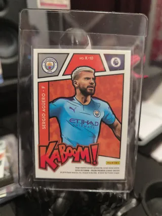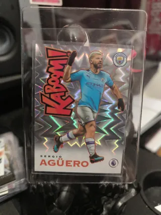 Carta coleccionable de Sergio Agüero, edición KaBOOM! del Manchester City. - Diseño con efecto brillante. - Incluye escudo del Manchester City. - Sello de la Premier League.