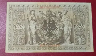 Billete de 1000 marcos alemanes de 1910 con sello rojo. - Diseño con águila imperial y figuras alegóricas. - Valor nominal de 1000.