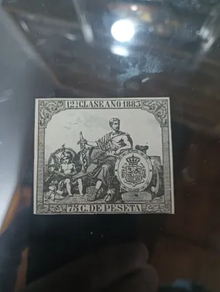 Detalle de sello fiscal de 12 clase del año 1883. - Diseño con figura central y escudo. - Inscripción 75 C. DE PESETA en la parte inferior.