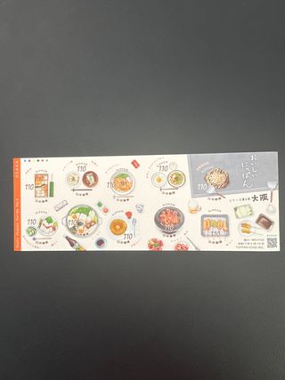 Hoja completa de sellos – Oishii Nippon Series No.6 (Osaka, Japón, 2022/2023) Se vende hoja conmemorativa de sellos de la serie oficial “Oishii Nippon” dedicada a la gastronomía japonesa, en este caso a Osaka, cuna de platos icónicos como okonomiyaki, kushikatsu o takoyaki. 📬 Detalles del producto: • Emisión oficial Nippon Post (Serie Oishii Nippon nº 6) • Tema: Gastronomía de Osaka • Valor facial: 110 yenes por sello (≈0,68 €) • Hoja completa con 10 sellos ilustrados • Estado: sin circular, perfecta conservación • Ilustraciones a color muy detalladas, ideales para coleccionismo temático (cultura japonesa, gastronomía, Asia)
